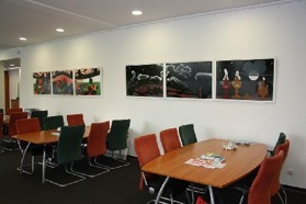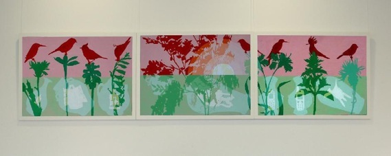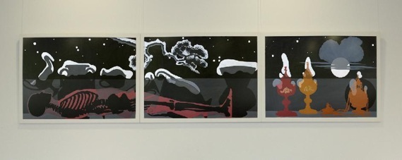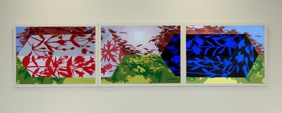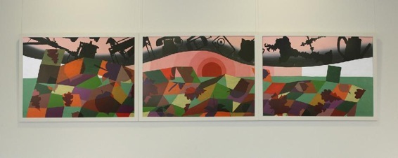Die Bilder sind dreiteilig zusammengefügt; langgestreckte Querformate. An die Lehrerzimmer-Wand, so lang sie auch ist, passen nur zwei davon. Zunächst der Herbst (die gegenwärtige Jahreszeit bei der Hängung) und - im Vorgriff - der Winter. Natürlich folgen auf Herbst und Winter schließlich Frühling und Sommer. In jedem Quartal muss ein Bild weggenommen werden, eines vorrücken und eines neu hinzutreten. Das hinzugekommene Bild erfüllt dann jeweils die Funktion eines Ankündigungsbildes. Diese Präsentationsform ist neu bei unseren Lehrerzimmer-Ausstellungen: eine Veränderung im Laufe der Jahreszeiten.