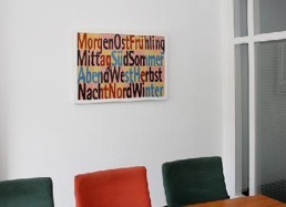 Die Bilder zeigen die charakteristische Bildsprache, die sich Jörg Eberhard über Jahre erarbeitet hat. Eine Sprache mit einem bestimmten Vokabular und mit einer eigenen Grammatik. Die konstituierenden Elemente sind: silhouettenhafte Bildzeichen (die Vokabeln), abstrakte Strukturierungen der Bildfläche (die Grammatik) und Farbe (die Aussprache oder Betonung). Die Bilder folgen erkennbar einem Programm: im Titel haben sie die vier Jahreszeiten. Diese sind verknüpft mit Tageszeiten und Himmelsrichtungen: Frühling/Morgen/Osten - Sommer/Mittag/Süden - Herbst/Abend/Westen - Winter/Nacht/Norden. Dieses Programm ist zunächst vielleicht nur Mal-Anlass, aber es wird thematisch durchaus ernsthaft durchgespielt.