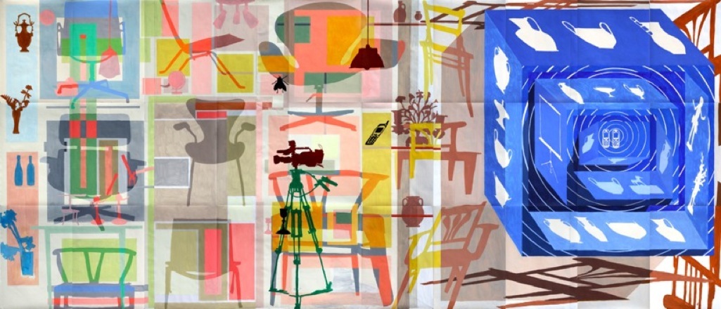 Ich möchte Sie nun einladen, Ihren eigenen Sehbewegungen zu folgen und Ihre Aufmerksamkeit zuletzt noch einmal auf die Schnittkante zwischen den beiden Teilen der Arbeit „Links / Rechts“ zu lenken. Hier beginnt in Lesrichtung der Wechsel zwischen ruhiger, geordneter und verzerrter, in Bewegung geratender Formensprache: Sessellehne, Handy und Stuhlbein werden vom Sog der im Mittelpunkt des Kubus entstehenden Kreisbewegung bereits erfasst. Auch sollten Sie es nicht versäumen, Ihr Augenmerk auf die maltechnische Seite des Kunstwerks zu lenken. Hier wird die Werkentstehung konkret erfahrbar in Pinselstrich, Farb- und Formüberschneidung. Ohne die Verwendung jedweder Schablone malt Jörg Eberhard die Silhouetten aus der Hand, zerschneidet mitunter bereits fertig gestellte Papiere und kombiniert sie einzelne Partien übermalend neu. Auch für ihn sind diese z.T. große Zeitabstände überbrückenden Kompositionen überraschend stimmig.